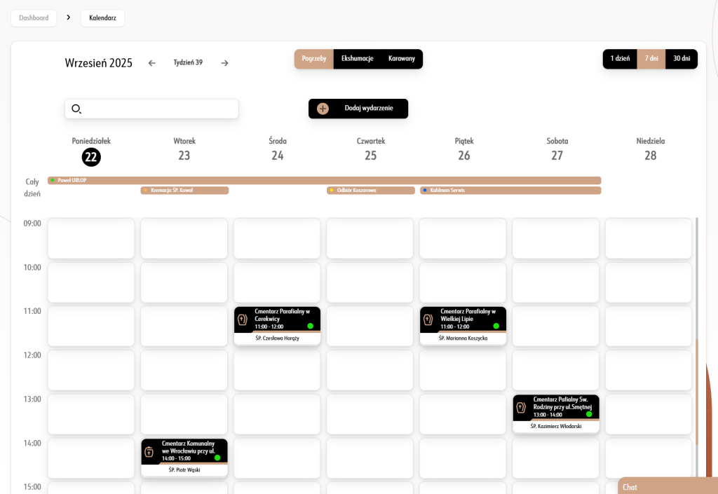 Od teraz w naszym systemie możesz tworzyć i przeglądać wydarzenia wielodniowe. To szczególnie przydatne w sytuacjach, gdy plan obejmuje więcej niż jeden dzień — np. urlopy pracowników, rezerwacje kaplic, czy dłuższe uroczystości.